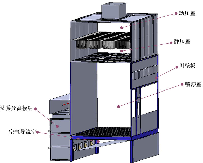 抽屜式漆霧分離模組干式噴漆室依次包括進風管、動壓室和靜壓式、噴漆作業(yè)室、漆霧捕集分離室、排風管、排風機等。